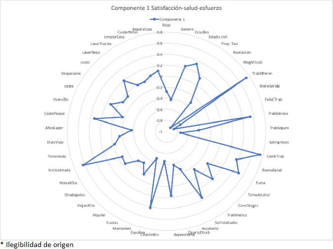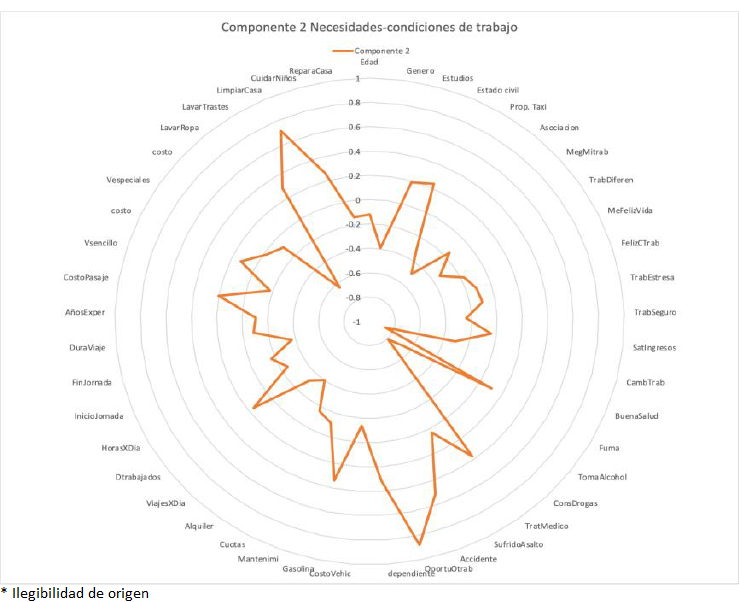 El segundo componente (Figura 4) se ha denominado Necesidades-condiciones de trabajo e incluye las relaciones latentes entre aspectos como: los gastos asociados a la satisfacción de las necesidades como las labores domésticas, así como el número de dependientes económicos, los costos del combustible y de tratamientos médicos y con un peso muy alto el deseo de tener otro tipo de trabajo si estuviera en sus posibilidades. Este componente incluye en sentido contrario (signo negativo) las condiciones y hábitos de salud de los operadores como su estado de salud en general y hábitos de consumo de alcohol o drogas. Debe destacarse que el 95% dijo no estar bajo tratamiento médico, el 80% considera que tiene buena salud, de la misma forma el 60% dijo no consumir alcohol (solo 4% lo hacen diariamente) y el 93% no consume drogas.