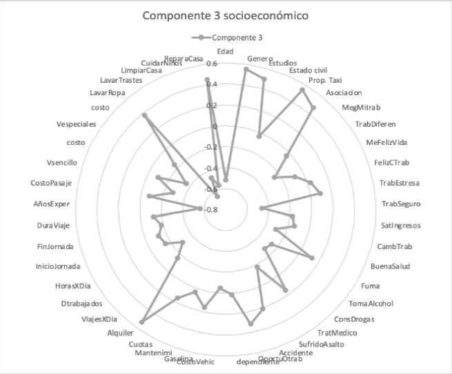 Se debe enfatizar que a medida que aumenta el número de componentes decrece su relevancia en la explicación de las relaciones subyacentes. Así, el tercer componente Socioeconómico (Figura 5), incluye las relaciones latentes que guardan aspectos como el género y el nivel de estudios, asociados a aspectos económicos como la propiedad del vehículo, el alquiler que pagan al dueño y la asociación a la que pertenecen y en sentido contrario la necesidad de realizar labores domésticas (como limpiar la casa o cuidar a los hijos) así como la edad de conductor.
