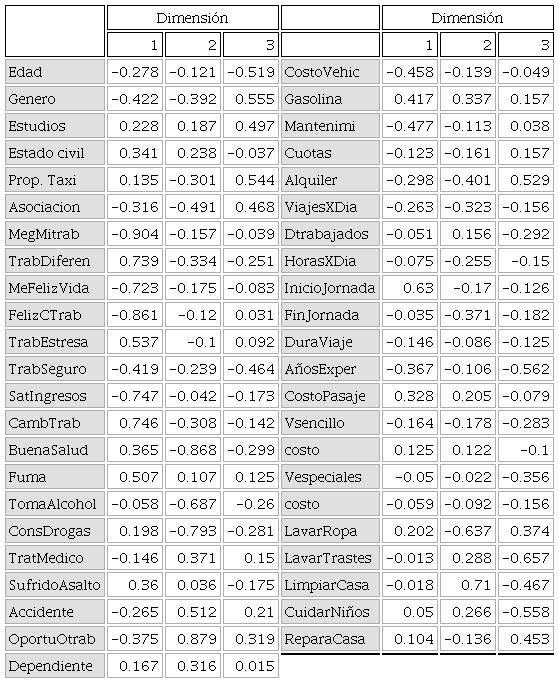Los resultados muestran que las relaciones subyacentes en las respuestas recolectadas se pueden agrupar estadísticamente en tres componentes principales que en conjunto son capaces de explicar el 80.5% de la variación observada en la muestra. Algunas de las principales conclusiones que se pueden extraer indican que el grupo de trabajadores bajo análisis padece exclusión por ingresos ($1706.791 que roza la línea de pobreza extrema por ingresos mensuales que CONEVAL (2020) ha fijado en $1,669.792, insuficientes para cubrir sus necesidades. Pero también: exclusión geográfica (municipio periférico); exclusión por ingresos (ingresos por debajo de la línea de bienestar); exclusión económica (limitaciones a oportunidades y empleo); exclusión de las facilidades (falta de acceso a sistemas de salud) y exclusión por tiempo (combinar el trabajo con labores domésticas y cuidado de los hijos), es decir el trabajo informal como conductor de mototaxis conforma con claridad un tipo de exclusión social.