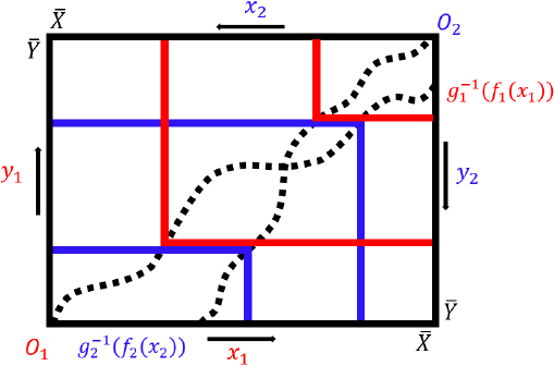 Donde , , y son funciones de valor real y estrictamente crecientes. Como puede verse en la Figura 1, las curvas de indiferencia de uno y otro individuo se “tocan” siempre en el área encerrada por6 y ─como esto ocurre tanto antes como después de intersecarse sus rayos de expansión, es evidente que ocurriría lo mismo en una situación en que los rayos de expansión no lleguen a cruzarse; no importa el tamaño relativo de las dotaciones. Aquí hay coincidencia de intereses y ningún individuo puede mejorar su situación sin empeorar la del otro (óptimos de Pareto).