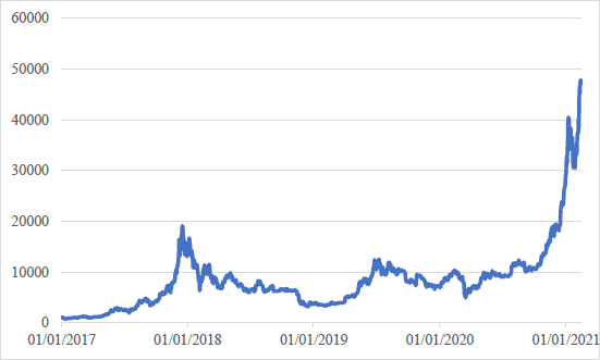 Another criticism of BTC is related to its fundamental value, which, according to some scholars is zero (e.g., Cheah & Fry, 2015); in other words, it has no intrinsic value, unlike gold, silver, or stocks, for example. As an observation, common FIAT money3, such as the US dollar or the Euro bills, also lack intrinsic value. In addition, as BTC must be “mined” on very powerful computers that require a lot of energy, the sustainability of its functioning has been seriously questioned as it is too energy intensive. Finally, the high volatility of Bitcoin prices makes it unpractical and useless for signaling prices, usually a basic money function, to be able to use it as a unit of account. Figure 1 shows the historic price changes of Bitcoin since January 2017. As it is observable from Figure 1, the price changes of Bitcoin indicate huge volatility, going from about 800 USD in early 2017 to above 19,000 USD by the end of the same year, and a drop to 6,300 USD by February 2018. The latest trend in the second half of 2020 shows another explosive price increase from about 5,000 USD in March to above 40,000 USD by February 6, 2021 followed by an all-time high of 49,375.94 USD on February 14, 2021 (Coindesk, 2021).