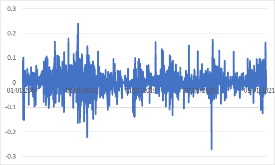 As empirical studies of the price history of financial assets usually use returns instead of market prices, Figure 2 shows also, the behavior of Bitcoin daily simple returns from 2017 to 2021. Once again one can observe the high volatility features of the cryptocurrency. Seemingly periods of high volatility alternate with periods of lower volatility. It appears that Bitcoin currently (beginning of 2021) undergoes a phase of relatively high volatility. Historically speaking the maximum (minimum) daily return occurred on December 10, 2017 (March 12, 2020) with 23.9% (-27.1%) (Coindesk, 2021).