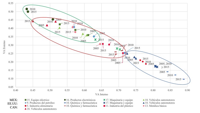 De la descomposición por origen del valor agregado contenido en las exportaciones manufactureras se encontró que las exportaciones mexicanas son las de menor valor agregado interno y que las estadounidenses son las de mayor valor agregado interno. En México, en los sectores con alto contenido de valor agregado externo la participación de EE. UU. es notable, aunque en el último año de análisis la del resto del mundo fue mayor. Destacan como sectores vinculados a las cadenas regionales de producción y dependientes de importaciones intermedias provenientes de la región: equipo de cómputo y electrónico (15), equipo eléctrico (16) y vehículos automotores (18).