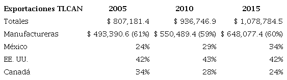 Por su parte, los datos de exportaciones bilaterales brindan información valiosa sobre la relación comercial entre los países del TLCAN: más del 90% de las exportaciones de México al TLCAN tienen como destino EE. UU., casi el 60% de las exportaciones estadounidenses se dirigen a Canadá y el 97% de las canadienses van a EE. UU. Los datos de las exportaciones manufactureras son muy similares: 93% de las exportaciones manufactureras de México van a EE. UU., 51% de las estadounidenses van a Canadá y 96% de las canadienses a EE. UU.
