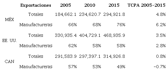 Para México, los subsectores manufactureros de mayor participación son: equipo de cómputo y electrónico (15), equipo eléctrico (16), maquinaria y equipo (17) y vehículos automotores (18). Cabe señalar que México concentra alrededor del 60% de sus exportaciones únicamente en los subsectores (15) y (18). Para EE. UU. los subsectores son: industria del petróleo (9), industria química y farmacéutica (10), maquinaria y equipo (17) y vehículos automotores (18). En el caso de Canadá, éstos son: industria alimentaria (5), industria química y farmacéutica (10), industria del plástico (11), metálica básica (13), maquinaria y equipo (17) y vehículos automotores (18).
