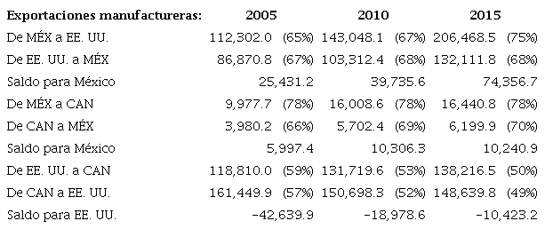 El comercio bilateral entre México y Canadá se comporta de manera similar, aunque con volúmenes de comercio menores; en el 2015 el 78% de las exportaciones de México a Canadá, y el 70% de las de Canadá a México fueron de manufacturas, por ello, México sostiene un superávit comercial manufacturero con Canadá de 10,240 millones de dólares. En contraste, las exportaciones de manufacturas entre EE. UU. y Canadá representaron en 2015 el 50% y 49% de sus exportaciones, en este caso, EE. UU. muestra un déficit comercial con Canadá de 10,423 millones de dólares (ver Cuadro 3).
