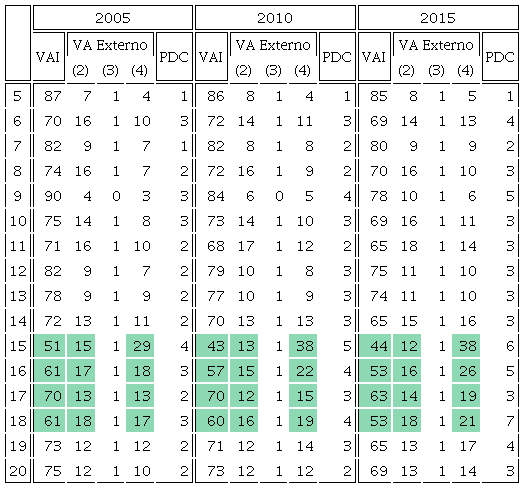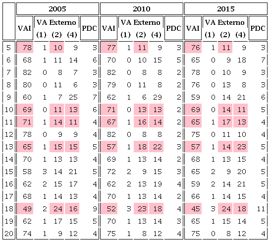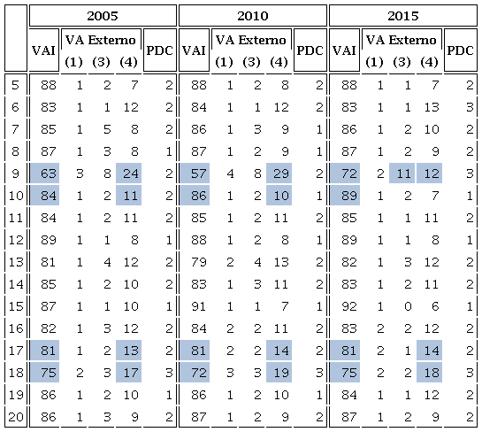 En los Cuadros 5, 6 y 7 se muestra la descomposición del valor agregado contenido en las exportaciones de cada país y sector en los años 2005, 2010 y 2015 según sus tres componentes: a) interno, b) externo, proveniente del resto de países del TLCAN o del resto del mundo, y c) el término de doble contabilidad pura. El país 1 es México, el 2 es EE. UU., el 3 es Canadá y el 4 es el resto del mundo. Las celdas sombreadas hacen notar la composición de los sectores más relevantes en las exportaciones de cada país.