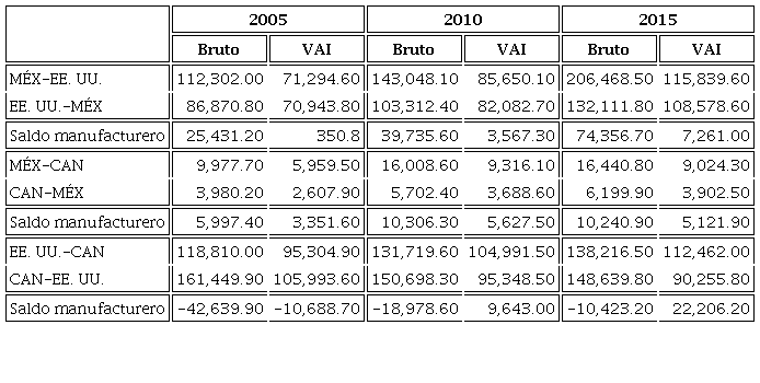 Al computar el saldo comercial manufacturero en valor agregado y compararlo con el saldo bruto se encontró que el superávit que mantienen México y Canadá con EE. UU. es mucho menor. En México, el saldo en valor agregado es menor al 10% del saldo bruto y en el caso de Canadá, este dejó de ser un superávit para convertirse en un déficit en el 2010. Estos datos dan evidencia de que EE. UU. aunque exporta menos de lo que importa de ambos países, el alto valor agregado interno contenido en sus exportaciones, incluso en sus importaciones, le ha permitido aminorar tales déficits hasta convertirlos en superávit.
