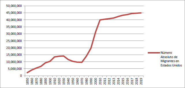Los datos históricos del Instituto de Políticas Migratorias34, como se puede observar en la gráfica siguiente, muestran que: desde 1850 hasta 1930, existió una tendencia creciente en el número de inmigrantes en Estados Unidos, fecha en que comenzó el único periodo en que se registró una tendencia descendente en la inmigración, que duró hasta 1970, año en que empezó un cambio exponencial positivo, llegándose a registrar 39.9 millones de inmigrantes en el 2010. De ese año al 2019, se registró una tendencia positiva estable, alcanzando, para el 2019, los 44.9 Millones de inmigrantes.
