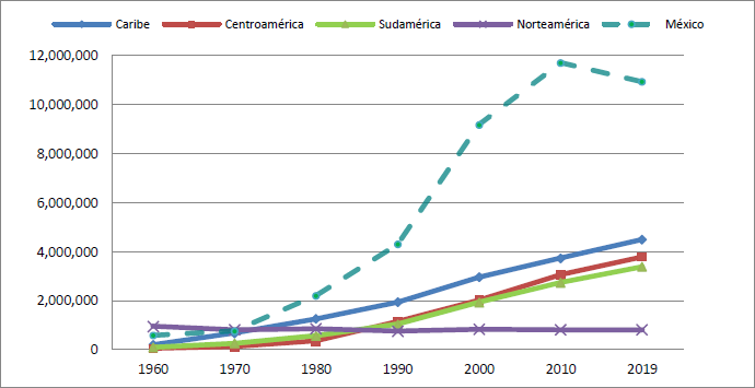 El especial interés de Estados Unidos por Centro América se explica en la Gráfica 3, que muestra que por región, si se considera de forma separada a México por ser un caso atípico en relación con las demás naciones del continente, Centro América ocupa el primer lugar de procedencia de inmigrantes. Desde 1980, Centro América sobrepaso a las otras tres regiones, registrando alrededor de 1.2 millones de inmigrantes en Estados Unidos ese año, manteniendo una tendencia creciente, hasta alcanzar los casi 4.5 millones en el 2019.