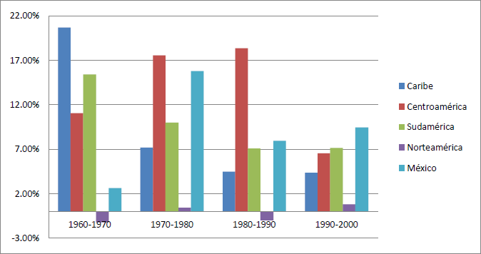 En cuanto al registro de las tasas de crecimiento regionales de inmigración. Históricamente desde 1960 hasta el 2000, Estados Unidos logró, en cada década, una desaceleración de las mismas en términos del promedio anual, aunque no de forma homogénea para todas las regiones del continente americano (Gráfica 4).