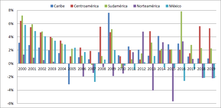 En términos de tasas anuales, desde el 2000, la única región que no registró ninguna tasa negativa de su migración hacia Estados Unidos fue precisamente Centro América. Por su parte, la región que más veces ha tenido tasas no positivas ha sido Norteamérica, que básicamente se refiere a Canadá, región que registró un histórico -6% en el 2015. En contraparte, la tasa más alta fue la de Sudamérica en el 2016 con 8%. Coyunturalmente, nótese que México solo ha registrado tasas negativas desde el 2014 (Gráfica 5).