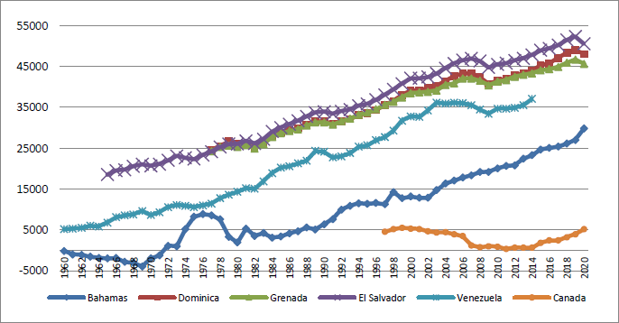 Lo primero que resalta, es la marcada divergencia entre el país que ha tenido la diferencia más baja de su PIB per cápita con respecto a Estados Unidos, es decir, Canadá, y las otras dos naciones que en promedio han tenido también las marcas más bajas: Bahamas y Venezuela (éste último por sus ingresos petroleros). Pues la divergencia entre Canadá con respecto a éste último, fue de aproximadamente $37,000 dólares en el 2014, y de casi $24,000 en el 2020 con Bahamas. Por su parte, son dos los países caribeños (Granada y Dominica) y uno de Centro América (El Salvador), los que conforman el grupo de naciones con las diferencias más altas de su PIB per cápita con respecto a USA. Llegando a ser, la del Salvador, la diferencia más alta, con un valor en el 2020 de casi $50,500 dólares.