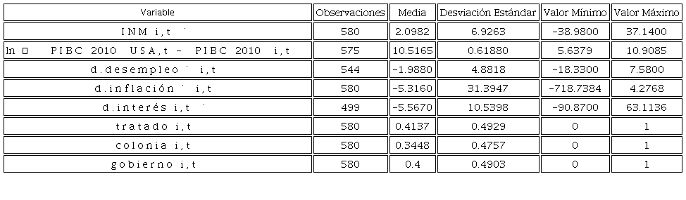 La fuente de datos utilizada fue el Banco Mundial, excepto en el caso de la tasa de migración hacia Estados Unidos, variable en la que se utilizaron los datos proporcionados por el Instituto de Políticas Migratorias, y en algunos casos particulares de la tasa de inflación, donde se usaron la base de datos de la CIA “World Factbook” y del Instituto Nacional de Estadística y Censos para el caso concreto de Argentina. Es necesario hacer mención que para los datos de la tasa de migración, por representar la variable dependiente a analizar, fue necesario aplicar técnicas de interpolación en todas las unidades de corte transversal, por lo menos del periodo del 2001 al 2005.