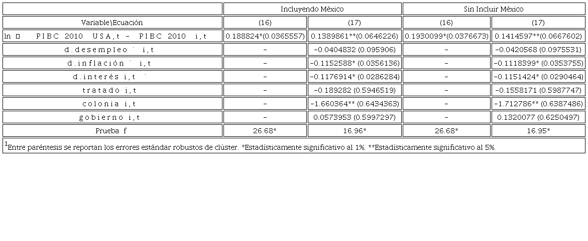 Sobre los resultados obtenidos, lo primero que se puede destacar, es que las mismas variables que se han identificado como significativas incluyendo a México como unidad de corte transversal, lo siguen siendo aun cuando este país no se considera propiamente en la regresión. Sin embargo, existen algunos cambios que se pueden destacar. Por ejemplo, en la regresión correspondiente a (16), cuando no se incluye a México, el coeficiente asociado a la diferencia del PIB per cápita, en términos logarítmicos, es ligeramente mayor, lo que indicaría que una reducción en la brecha del ingreso debería de traducirse en un decrecimiento más pronunciado de la tasa de migración hacia Estados Unidos por parte de todos los países del continente, cuando menos un poco más que la de México. Misma interpretación que se puede aducir en la estimación de (17), pues ese mismo coeficiente sigue siendo mayor que cuando no se incluye a México.