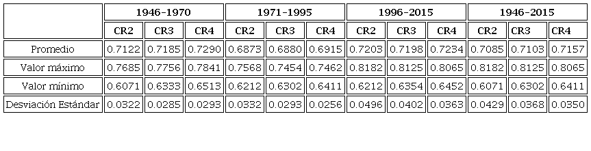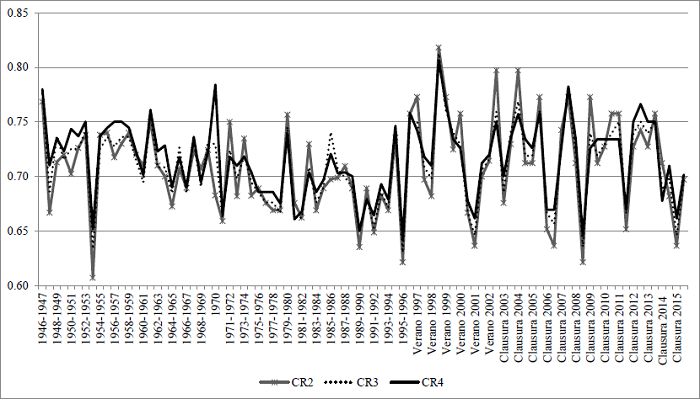 Los Cuadros 2 y 3 muestran los valores promedio, máximo y mínimo registrados por la familia de indicadores CRk y, por el IHHe, en los periodos establecidos, y en el total de la serie estadística (1946-2015). Los resultados exhiben menores niveles de concentración, es decir un BC más elevado en el segundo lapso de análisis (1971-1995), y un fuerte descenso de la equidad en la competencia en 1996, año en que se implementan los torneos cortos. Esta primera aproximación parece indicar, por un lado, que el establecimiento de la liguilla en 1971, junto con el sistema de grupos en 1976, aunado a las mayores inversiones realizadas con motivo del mundial de 1970, resultaron en temporadas más reñidas. De hecho, el periodo 1971-1995 no solamente registra los menores niveles de concentración del rendimiento deportivo con un IHHe promedio más cercano al de una competencia perfectamente balanceada, sino también, la serie de datos más estable con niveles inferiores en la desviación estándar, así como en la brecha entre los valores máximos y mínimos de los indicadores. Por otro lado, y en sentido contrario, el cambio en el sistema de competencia, en dirección de dos torneos cortos por año, con el fin de aumentar los ingresos obtenidos mediante la realización de dos liguillas finales anuales, pudiera haber afectado el BC en la liga mexicana de fútbol haciéndola a su vez más inestable.