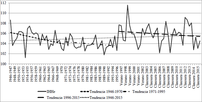 Esta primera aproximación parece, a su vez, confirmar la validez de los periodos preestablecidos, ya que permiten distinguir los cambios de tendencia antes mencionados. Al respecto, los Gráficos 1 y 2, ilustran los comportamientos de 1946 a 2015 de las ratios CR2, CR3, y CR4 y del IHHe. Al tomar en cuenta la serie estadística en su conjunto, los indicadores de concentración se incrementan en dirección de una posible reducción del BC en la liga, tal y como lo muestra la recta de tendencia dibujada en el Gráfico 2. No obstante, si se consideran por separado los tres subperiodos delimitados, la tendencia al interior de cada uno de ellos es negativa, y traduce un aumento progresivo del BC. La aparente contradicción se explica por el salto en el nivel de los indicadores (disminución pronunciada del BC), a raíz del establecimiento de los torneos cortos en 1996.