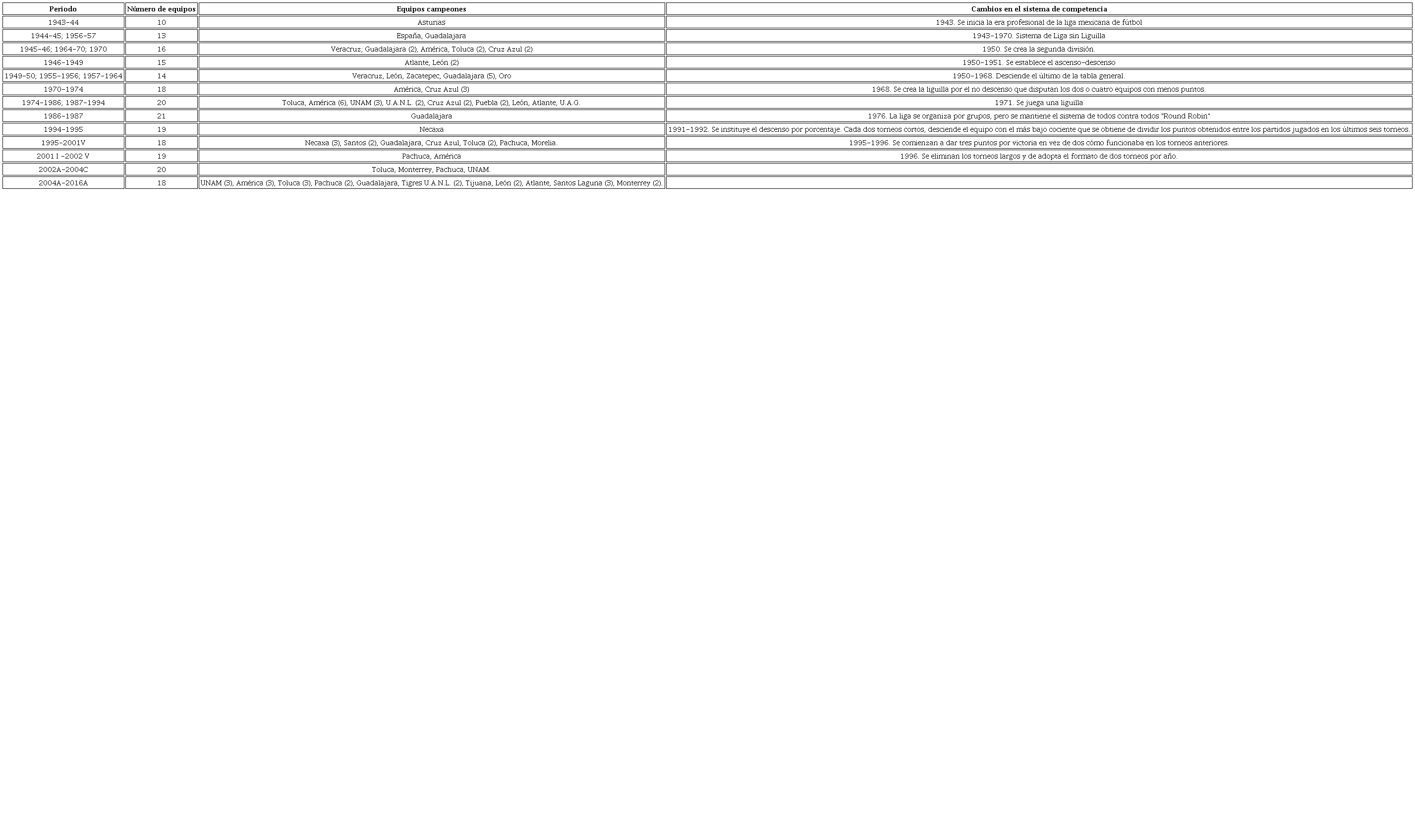 En cuanto a las fuentes estadísticas, los datos provienen de la base Rec. Sport. Soccer Statistics Foundation (R.S.S.S.F.) que reúne los resultados históricos de las competencias profesionales de fútbol de la mayoría de las ligas del mundo desde inicios del siglo veinte a la fecha. La delimitación de los subperiodos de estudio considera los principales cambios registrados en el sistema de competencia y las modificaciones en el número de participantes de manera a mantener un número relativamente homogéneo a lo largo de cada lapso. En 1943, ante las presiones por parte del gobierno, los clubes de la liga mayor aceptaron registrar como profesionales a los futbolistas ante la Secretaría del Trabajo, de tal forma que, el cambio fundacional del campeonato de la liga mayor no estuvo relacionado con un nuevo formato de competencia, si no con un cambio contractual y fiscal de la relación entre la liga y las autoridades. Mientras el número de equipos se amplió, debido a la inclusión de plantillas provenientes de otras ligas, el número de extranjeros se limitó a cuatro por escuadra. A grandes rasgos, de 1943 a 1970, se utilizó un sistema de liga sin liguilla, y el número de competidores osciló alrededor de los 14.
