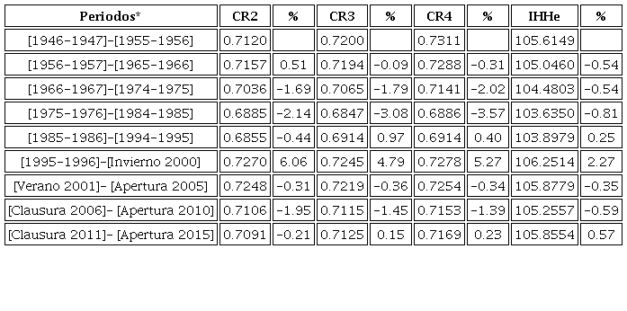 En el Cuadro 5, se presentan los cambios porcentuales en los promedios de las distintas medidas de concentración al dividir la serie estadística en etapas más cortas de 10 competencias cada una. Al comparar el nivel de los indicadores, con sus valores del lapso anterior, los únicos periodos con un deterioro en el BC son 1995/96-2000I, 1985/86-1994/95 y 2011C-2015A. Es de señalar sin embargo que con la notable excepción ya comentada del lapso relativo al establecimiento de los torneos cortos (1995/96-2000I), ninguna de estas etapas debe ser considerada de desequilibrio competitivo. En 1985/86-1994/95, las medidas analizadas tienen, haciendo abstracción del periodo inmediato anterior, los niveles más bajos de toda la serie. En cuanto al lapso 2011C-2015A, los valores del IHHe y de la familia de indicadores CRk se encuentran todos próximos a su promedio histórico, además, tres equipos diferentes logran en ese tiempo conquistar dos campeonatos cada uno (León, América y Tigres). En suma, si bien el establecimiento de los torneos cortos parece haber afectado en un sentido negativo tanto lo reñido de la liga, como la estabilidad de los rendimientos deportivos en la misma, el fútbol profesional mexicano registra una tendencia histórica sostenida y consistente hacia un mayor BC.