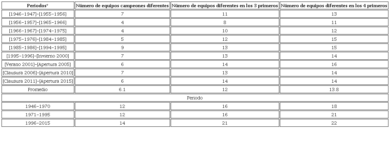 En términos dinámicos, al tomar en cuenta los grandes periodos delimitados, la dominación de la liga por parte de un grupo de equipos parece, contrariamente a lo esperado, haber aumentado. En el primer lapso de análisis (1946-1970), compuesto por 25 temporadas, 12 conjuntos diferentes consiguieron ser campeones, 16 acabaron la competencia entre los primeros tres y, 18 entre los cuatro líderes. Mientras en la segunda etapa (1971-1995) de 26 temporadas, estas cifras fueron de 12, 16 y 21 respectivamente, en la tercera (1996-2015), compuesta por 39 torneos en total, solamente 14 planteles distintos se proclamaron campeones, con 21 y 22 equipos alcanzando los primeros tres y cuatro lugares de la tabla. En promedio, el número de campeones diferentes por competencia cayó de 0.48 entre 1946 y 1970, a 0.46 en el segundo lapso y, a 0.36 en la tercera etapa, por lo que, en términos dinámicos, entre 1946 y 1970, el BC es el mayor de la serie. Este resultado se explica en particular, por el elevado equilibrio competitivo en los años pertenecientes al nacimiento del profesionalismo en la liga mexicana de fútbol, entre 1946/47 y 1955/56, 7 conjuntos de 22 competidores se proclamaron campeones, mientras 11 y 13 de dicho total, lograron ubicarse entre los tres y cuatro líderes del certamen (ver Cuadro 6).