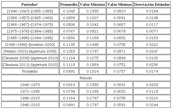 En términos de las dimensiones establecidas por Vrooman, si se consideran por separado los tres subperiodos delimitados, los torneos anuales resultaron cada vez más apretados, ya que las tendencias de las series de las ratios CR2, CR3, CR4 y del IHHe al interior de cada uno de los subperiodos son negativas y traducen un aumento progresivo del BC. En términos dinámicos, el número de campeones diferentes por competencia cayó de 0.48, entre 1946 y 1970, a 0.46 en el segundo lapso, y a 0.36 en la tercera etapa, por lo que, entre 1946 y 1970, el BC es el mayor de la serie. Finalmente, los cálculos del índice SI, referentes a la estabilidad de los rendimientos deportivos de una competencia a otra, confirman que mientras el periodo reciente de los torneos cortos (1996-2015) es el más irregular, el lapso 1971-1995, tras la realización de la copa mundial de 1970, es el más estable en la continuidad de los rendimientos deportivos además del de menor concentración en el reparto de puntos.