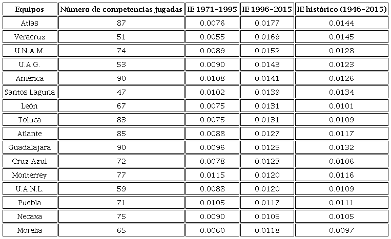 En cuanto a los dos primeros periodos de análisis, entre 1946 y 1970, el valor máximo del IHHe (108.66) se corresponde a la temporada 1946-1947, en ese año, la liga cuenta con la participación de 15 equipos y el Atlante consigue ser campeón con 42 puntos por 17 del equipo colero Marte. De forma relevante, el mayor equilibrio competitivo de toda la serie estudiada (1946-2015) se da en dicho lapso durante la temporada 1953-1954 que concluye con el Marte, primer lugar (26 puntos), sacando solamente ocho puntos de ventaja sobre el doceavo y último puesto (Atlas con 18 puntos). Entre 1971 y 1995, la liga experimenta un importante periodo de expansión geográfica y económica de la mano de un fuerte crecimiento deportivo. En la temporada 1974-1975, participan por primera vez en la competencia un total de 20 equipos representantes de 11 Estados de la república y, a partir de 1983, la cobertura televisiva se extiende con la difusión de equipos como León, Tigres, Monterrey, Puebla y Deportivo Neza por parte de la televisora estatal IMEVISION (Ramírez, 2010). En nuestra periodicidad de la historia de la liga de fútbol profesional en México, el lapso 1971-1995 es debido a lo anterior, el de mayor BC y estabilidad en el rendimiento deportivo.