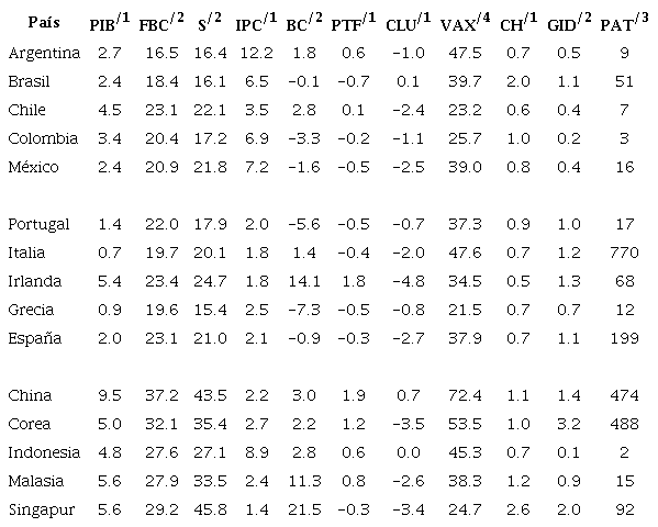 A más de tres décadas de la consolidación de este nuevo orden económico y monetario los resultados son diametralmente opuestos. En América Latina los claroscuros son particularmente profundos, especialmente en Brasil y México, si bien se ha logrado sustentar una condición de estabilidad macroeconómica, la dinámica del producto se asienta en una tendencia de estancamiento económico. En la base de esta dicotomía aparece la contracción persistente de la productividad y las reducidas tasas de inversión/ahorro, con un exiguo margen en la formación de capacidades tecnológicas. En efecto, los sesgos de eficiencia de la malla industrial para enfrentar la competencia mundial, así como la profundización de los patrones de especialización productiva y comercial en actividades primario/extractivas y de maquila/ensamble, representan algunos factores relevantes para explicar la exigua internalización de las ganancias dinámicas (asociadas con el comercio internacional y la IED), la baja capacidad de arrastre/dispersión del sector manufacturero y el apalancamiento de la competitividad en la deflación salarial y el deslizamiento de los precios relativos (véanse cuadro 1 y 2).