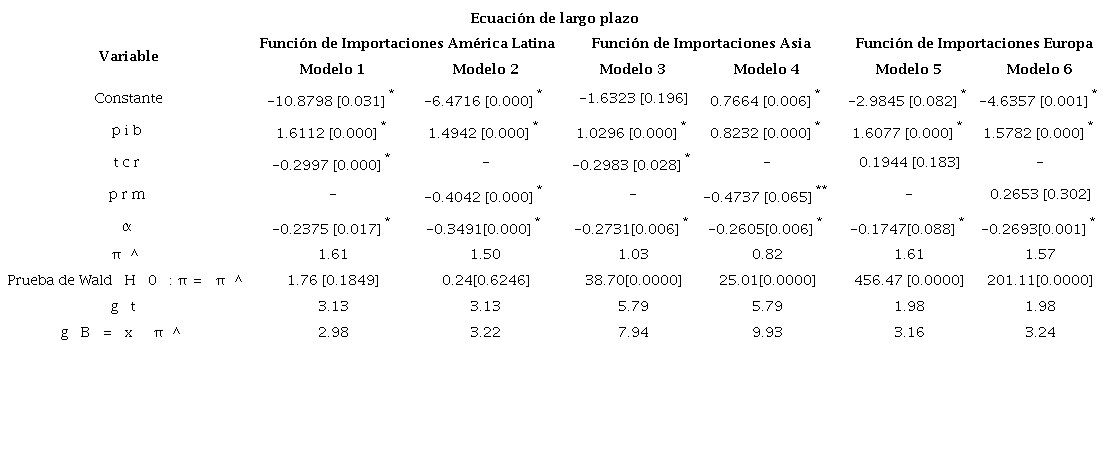Segundo, se prueba si la elasticidad ingreso de las importaciones estimada () e hipotética () son estadísticamente iguales, lo que significaría que la tasa de crecimiento observada del producto () es igual aquella compatible con el equilibrio de balanza comercial (), lo que indicaría que, en condiciones de déficit comercial sistemático y subutilización de capacidad instalada, la dinámica económica estará restringida por Balanza de Pagos (Thirlwall, 2003).