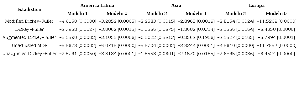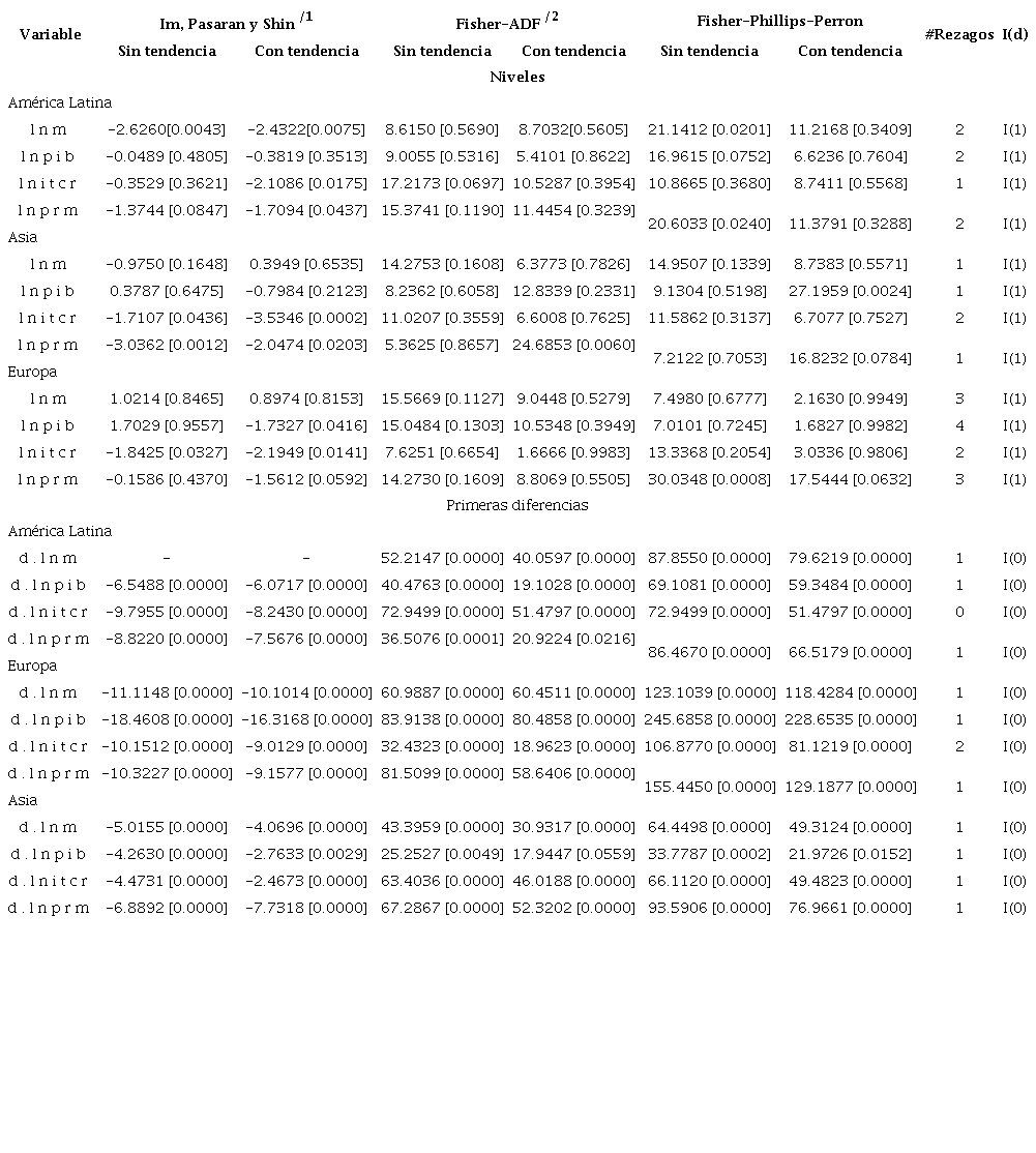 Por procedimiento, el análisis empírico inicia con el estudio de las propiedades estocásticas de las variables incluidas en el modelo, mediante las pruebas de Dickey-Fuller Aumentada (ADF) y Phillips-Perron (PP), según los resultados éstas son integradas de orden uno en niveles y procesos estocásticos estacionarios en primeras diferencias. Enseguida, se verificó si entre las series del sistema persiste una relación de equilibrio, con base en el algoritmo de Kao (1999) cuyos estadísticos confirman convergencia al equilibrio (cointegración), véase anexo A, cuadro A.1 y cuadro A.2.
