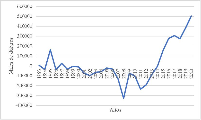Con datos del Banco de México (2020) se elaboraron las series de tiempo de las exportaciones e importaciones agropecuarias, así como el saldo de la Balanza Comercial Agropecuaria en dólares para el mismo periodo (1993-2020).