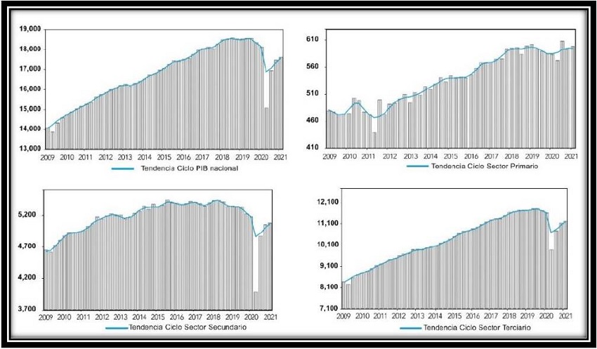 Finalmente, con base en los reportes del INEGI (2021a), las gráficas (figura 2), muestran la secuencia de crecimiento del PIB nacional y de los tres sectores de la economía de 2009-2021. Como resultado de la crisis por la pandemia COVID-19 en el tercer trimestre del año 2020 el PIB nacional tuvo una caída drástica del -8.5%, al igual que el sector secundario con -8.7% y la del sector terciario del -8.6%, No obstante, el sector primario mantiene su crecimiento positivo del 4.7%. Se observa el fuerte despunte en el segundo trimestre del año 2021 con una variación porcentual anual del 19.9% para el PIB, 6.4 % para el sector primario, 27.5% secundario y 17.7 % para el sector terciario. La recuperación de 2021 puede entenderse como un efecto «rebote».