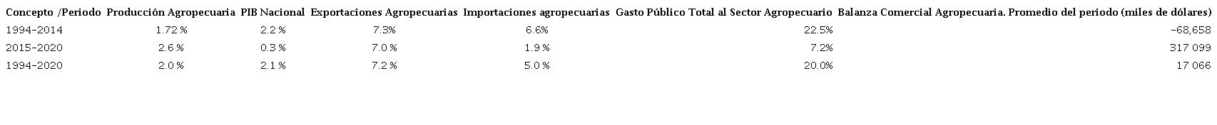 En México, desde la entrada en vigor del TLCAN en 1994, logran identificarse dos periodos, el primero abarca de 1994 a 2014, en que la Balanza Comercial Agropecuaria se mantiene en déficits constantes debido principalmente a la falta de autosuficiencia alimentaria. Y el segundo periodo es de 2015 hasta 2020, cuando la Balanza Comercial Agropecuaria se mueve hacia un vigoroso superávit. La producción agropecuaria responde favorablemente al crecimiento en la demanda de exportaciones destinadas principalmente al mercado norteamericano. Este impacto positivo se deja ver en el resto de la economía.