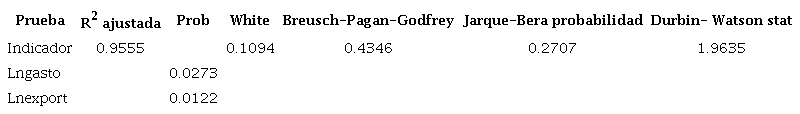 Entre las bondades del modelo estimado se encuentran un coeficiente de determinación (R2 ajustada), es decir, una capacidad de explicación de las variables independientes con respecto a la variable dependiente del 95%; las dos variables independientes son significativas (Prob). Con un valor mayor a 0.05 las pruebas White, Breusch-Pagan-Godfrey y Jarque-Bera comprueban que el modelo es homocedástico -para las dos primeras- y que la probabilidad de los errores se distribuye normalmente para el caso de la Jarque-Bera. Por su parte, la prueba Durbin-Watson verifica la ausencia de autocorrelación, para lo cual se aplicó la variable autorregresiva de primer orden AR(1) (cuadro 2).