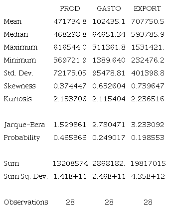 Las estadísticas descriptivas de las variables del modelo se especifican en el cuadro 3. Los valores absolutos de los estadísticos de las variables son, en primer lugar, la media, para la producción agropecuaria (PROD) la media del valor total de la muestra es de 471,734.8 millones de pesos constantes a precios de 2013 (mdpc). La mediana (valor que separa la mitad entre el rango superior e inferior de los valores) es de 468,298.8 mdpc. Se muestran también los valor máximos y mínimos en las mismas unidades monetarias y la desviación estándar de la muestra, es decir, lo que difiere en promedio el valor de la PROD en el periodo de estudio. La probabilidad de normalidad con la prueba Jarque Bera con valores mayores de 0.05 por lo que indican que los errores se distribuyen normalmente y los valores de curtosis y asimetría son los adecuados. La media de la variable (GASTO) se ubica en 102,435.1 millones de pesos a precios constantes de 2013, se muestran, al igual que la variable anterior sus estadísticos. Para las exportaciones (EXPORT) el valor de la media es de 707,750.5 miles de dólares, en las mismas unidades monetarias está la mediana y los valores máximos y mínimos, así como los otros estadísticos de esta variable.
