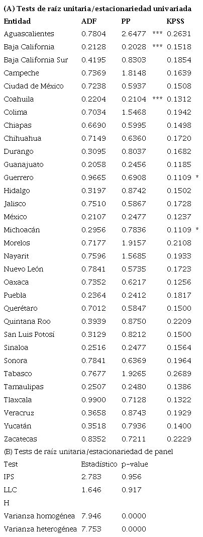 Adicionalmente, la metodología de datos de panel incrementa el poder de los test estadísticos al combinar elementos de sección cruzada con series de tiempo, haciendo más confiables los resultados que las pruebas estándar, donde los estimadores tienen a una distribución normal (Baltagi y Kao, 2003); sin embargo, es necesario determinar el nivel de integración de las series para evitar resultados espurios. Una alternativa son las pruebas tipo Fisher que, primero prueban la existencia de raíces unitarias para cada panel individualmente y, después, combinan los valores de p resultantes para la prueba total. También se emplean las pruebas de raíz unitaria de panel Levin, Lin y Chu (LLC), Im, Pesaran y Shin (IPS), Kwiatkowski, Phillips, Schmidt y Shin (KPSS)y Hadri (H).