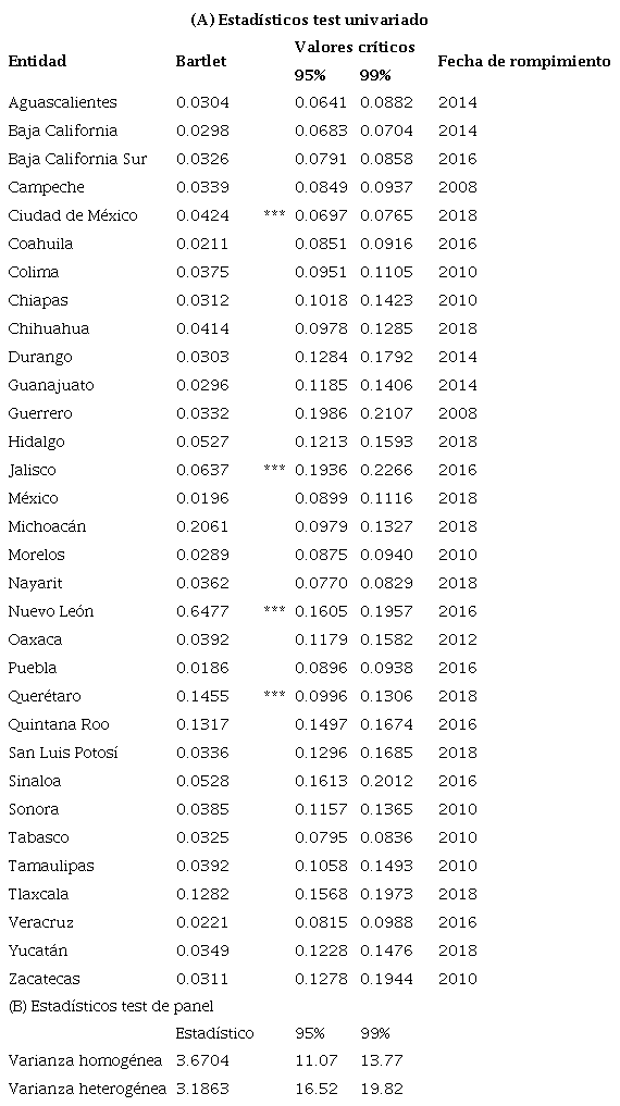 En general, del panel A se tiene que, al permitir múltiples quiebres estructurales en la prueba de estacionariedad, la hipótesis nula de estacionariedad se rechaza solo para Ciudad de México, Jalisco, Nuevo León y Querétaro. Además, al considerar las varianzas a largo plazo homogéneas y heterogéneas, se encuentra que la hipótesis nula (todas las entidades son estacionarias) no se rechaza en los niveles significativos, por lo que se acepta que el panel de 32 entidades para la pobreza es estacionario en el periodo 2008-2018.