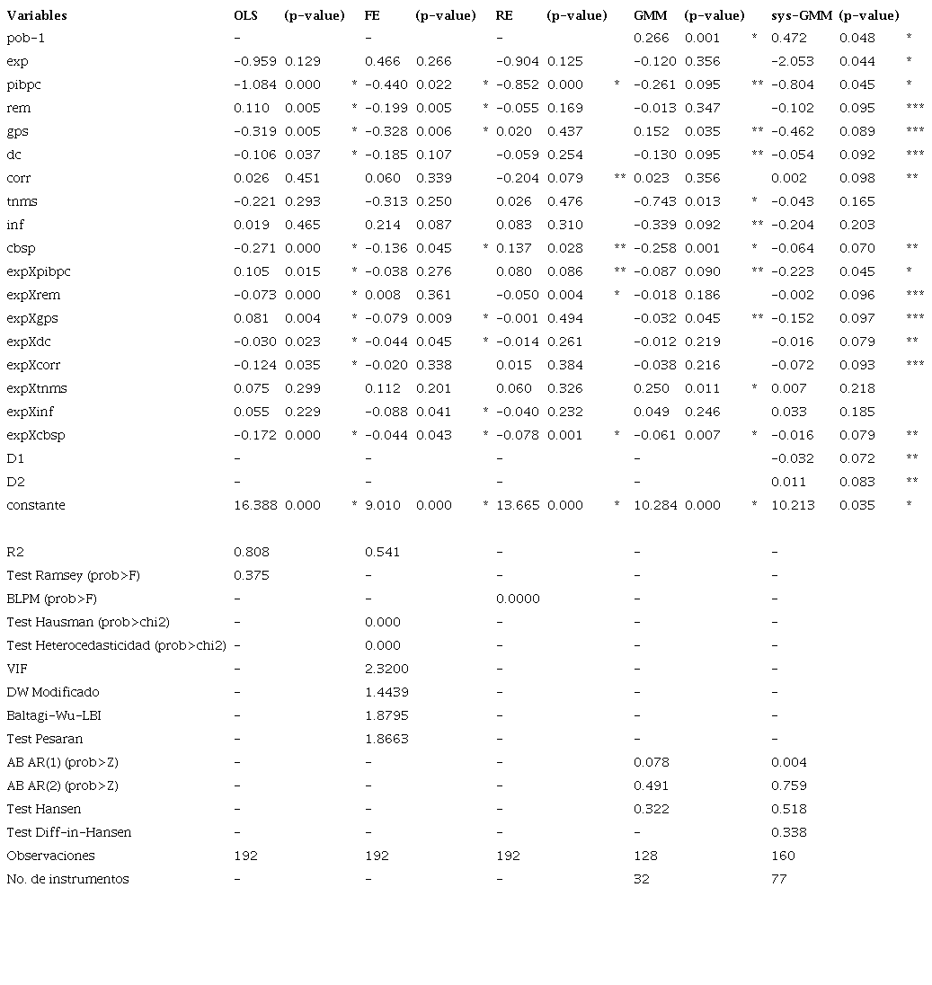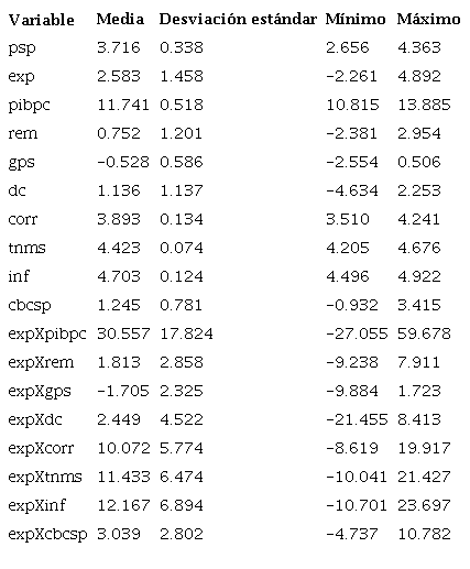También se incluye un conjunto de variables de control usuales en el modelaje de la pobreza a nivel macroeconómico, a saber: ingreso per cápita, aproximado por el PIB per cápita (pibpc), para recoger el efecto del desarrollo económico; tasa neta de matriculación en secundaria (tnms), proxy de la educación; una variable de profundidad financiera, definida como el crédito otorgado por la banca comercial al sector privado como proporción del PIB (cbcsp); inflación que controla la inestabilidad macroeconómica (inf); un indicador de calidad o estabilidad institucional aproximado por la corrupción (corrup) -mide la percepción de la corrupción como problema en la entidad-; densidad carretera para aproximar la infraestructura (dc); remesas desde el extranjero como proporción del PIB (rem) para controlar por el ingreso generado y enviado desde el exterior del país; y gasto público (gp), definido como la suma de la inversión pública en obra pública, en proyectos productivos y otras acciones de fomento como proporción del PIB.