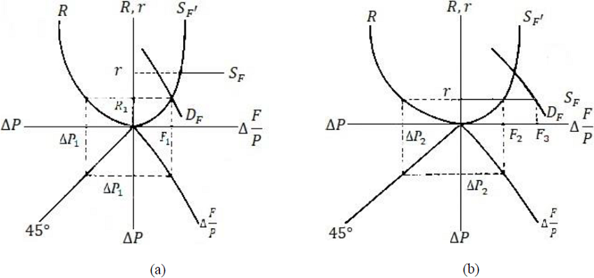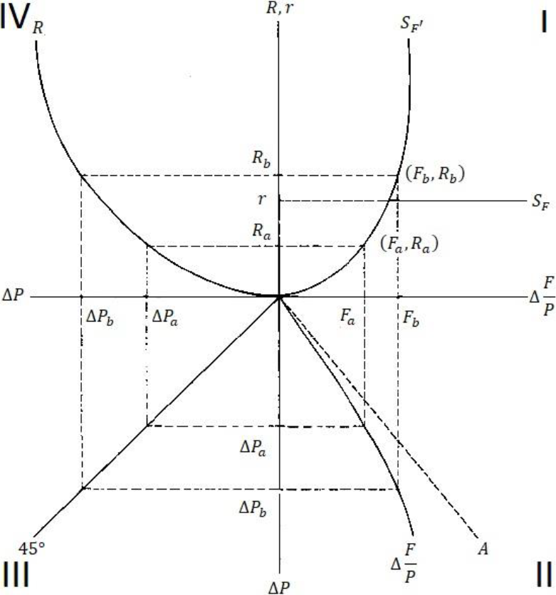 Por su parte, el cuadrante III no es más que una recta con pendiente de 45 grados que sirve para relacionar con en el cuadrante IV, en el cual se puede ver que, a medida que son más significativos los incrementos del precio (de a , por ejemplo) el aumento del costo interno del financiamiento es proporcionalmente mayor, hasta hacerse infinito por la caída del flujo de ingresos netos correspondiente a aumentos de precios muy significativos.