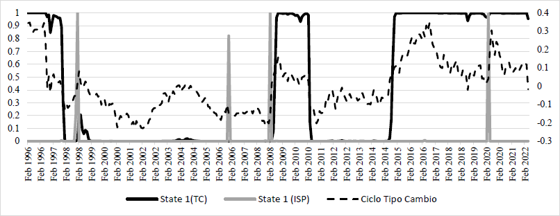 En este tenor, para la economía mexicana, se hizo una estimación de la relación que existe entre el ISP, el tipo de cambio y la actividad económica durante el periodo 1996-2022, a través de dos propuestas: la primera a partir de una representación de cambios de régimen con un modelo de Markov-Switching, en la que se observó que el ISP en México antecedió a las dos fases de crisis del tipo de cambio y el IGAE, pero en las otras dos eventos de contracción no muestra alguna relación, siendo el comportamiento de este índice acíciclo. Empero, estos resultados no permitieron hacer alguna conjetura sobre la precisión de este modelo como sistema de alerta temprana.