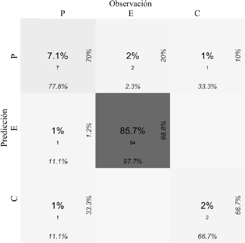 A partir de los momentos de vulnerabilidad en el periodo de estudio, se utiliza el 69% de los datos para entrenar (219 observaciones) el SVM para clasificar cualquier vector que sea representativo de alta fragilidad, crisis y un evento que no lo es, permitiendo clasificar a partir de este vector a los meses como crisis, alta fragilidad o estabilidad. En el Cuadro 3, se presenta los principales resultados de las matrices de confusión de los distintos modelos SVM estimados y que fueron validados en términos de los parámetros de ajuste, con el 31% de los datos restantes (98 observaciones) se utilizaron para evaluar la precisión de los algoritmos.