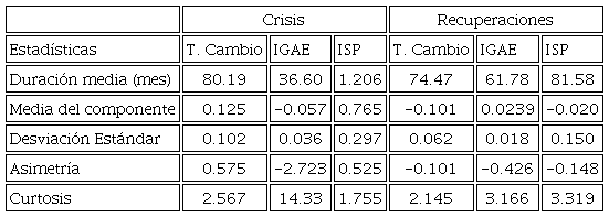 Al determinar las fases de crisis del tipo de cambio, IGAE e ISP, se procede a utilizarlos para estudiar la amplitud y duración de cada una (Cuadro 1). Para el caso del Tipo de cambio en periodos de crisis, presentó una duración promedio de 80.19 meses, con una media del componente cíclico del 0.125 y una desviación estándar de 0.102; pero en fases de recuperación mostró una duración promedio de 74.47 meses con una media de -0.101 y una desviación estándar de 0.062; el IGAE en fases de crisis tuvo una duración promedio 36.60 meses con una media de -0.057 y una desviación estándar de 0.036; en fases de recuperación el IGAE presentó una duración promedio de 61.78 meses y una media de 0.0239; en el caso ISP esta tuvo una duración promedio de 81.58 meses con una media de -0.020.
