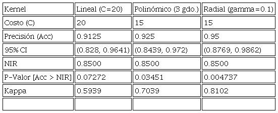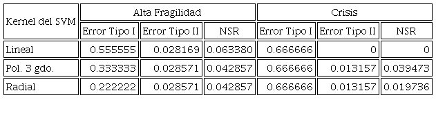 De acuerdo con los resultados obtenidos el kernel que presenta un mejor predicción es el Radial al mostrar un desempeño conjunto del 95% y un valor de kappa 0.8102, a su vez siguiendo la idea de Kaminsky et al., (1998) y Herrera y García (1999) se construyeron tres medidas para evaluar los distintos modelos, la primera es el error de Tipo I el cual funciona como un indicador de las señales no enviadas en presencia de alta fragilidad o crisis; la segunda es el error Tipo II que muestra cuando se envían señales de alerta y no se da ningún suceso de fragilidad o crisis. El último es la ratio ruido señal que nos mostrará las señales erróneas como porcentaje de las correctas.