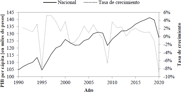 En primer lugar, se plasma a continuación el comportamiento del PIB per cápita en México a nivel nacional, así como la tasa de crecimiento de la misma variable en las últimas tres décadas.