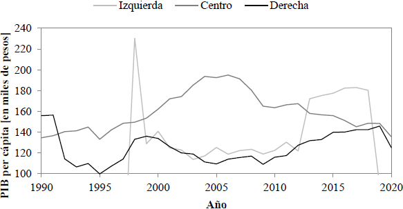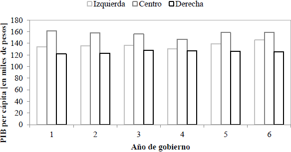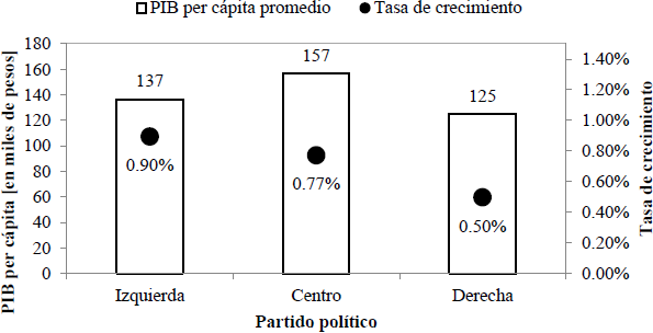 Respecto al comportamiento promedio a lo largo de todo el periodo de estudio, el Gráfico 5 muestra por ideología, tanto el PIB per cápita promedio como la tasa de crecimiento económico, en el cual el centro ha presentado en promedio, un mayor nivel de producción, seguido por la izquierda y de la derecha. No obstante, la izquierda es quien ha presentado las mayores tasas de crecimiento, seguido por el centro y después por la derecha. Esto es consistente con la teoría del CPE y es lo que será probado estadísticamente con el fin de determinar si el partido ha tenido un efecto en el crecimiento económico de manera cíclica como lo indica la teoría del CPE o simplemente, se debe a otros factores heterogéneos de las diversas Entidades Federativas.