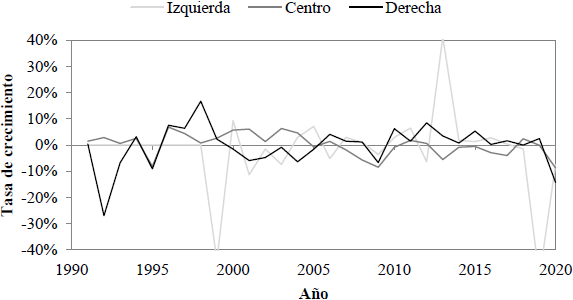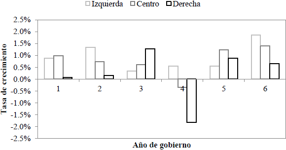 Por lo anterior, se rechaza la hipótesis planteada en este artículo, ya que no se ha encontrado evidencia estadística que muestre que, de manera cíclica, la izquierda y la derecha presenten mayores y menores tasas de crecimiento, respectivamente. Solamente se ha encontrado evidencia que indica que, se manera sistemática, la derecha presenta menores tasas de crecimiento, más no se encontró evidencia respecto a la izquierda, por lo que, incluso este hallazgo describe un comportamiento partidista sistemático, pero solamente parcial.
