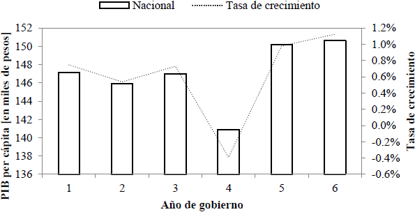 Ahora bien, en el Gráfico 6 se representa el promedio tanto del PIB per cápita como de la tasa de crecimiento económico en el país por año de gobierno, considerando periodos de seis años para los gobernadores. Cabe destacar que en este cálculo se han hecho las correcciones pertinentes, debido a la presencia de mandatos incompletos por cuestiones políticas o debido a otro tipo de contingencias.