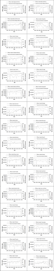 Con el objetivo de mostrar la dinámica individual por Entidad Federativa, en el Anexo 5, se muestran las tendencias individuales por Entidad Federativa, tanto del comportamiento del PIB per cápita con su respectiva tasa de crecimiento.