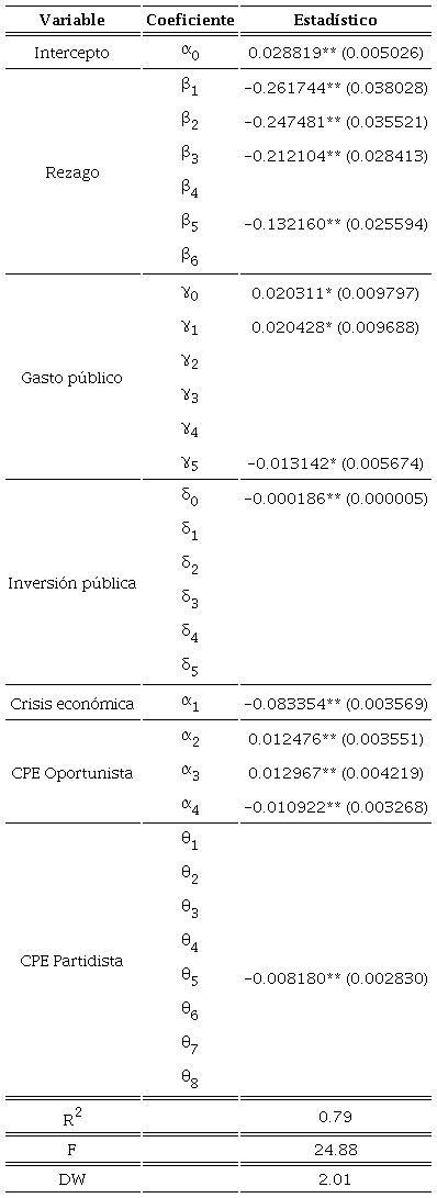 Por otro lado, se ha encontrado evidencia empírica de la presencia del CPE en su modalidad oportunista, ya que los signos de los coeficientes de las variables dicotómicas relacionadas al ciclo electoral son significativos, y conforme a lo esperado, ya que en el año previo a las elecciones y en año de elecciones, la tasa de crecimiento de la producción se incrementa, mientras que en el año posterior a las elecciones disminuye. Finalmente, respecto a las variables binarias que pretendían capturar el CPE en su modalidad partidista, tan solo la variable que denota la administración de un partido de derecha es significativa, por lo que puede decirse que un Estado que es gobernado por un partido de derecha sistemáticamente presenta tasas ligeramente menores que cuando es gobernado por un partido político del centro; sin embargo, ninguna de las variables que pretendían capturar la presencia del ciclo y su interacción con el partido político ha sido significativa. Por esta razón, solo se han encontrado indicios del CPE en su enfoque partidista, donde dichos indicios han sido parciales, ya que ningún coeficiente de la variable relacionada al partido político de izquierda ha sido significativo.
