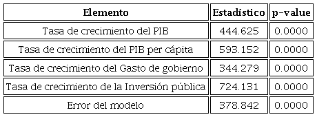 En la Tabla 1 se pueden observar diversos hechos interesantes. El primero de ellos es que en el modelo el intercepto es significativo y positivo, por lo que, en promedio, la tasa de crecimiento del PIB per cápita de una Entidad parte de una tasa de crecimiento positiva. Respecto al autorregresivo de la variable dependiente, existe cierta persistencia, por lo que la variable depende parcialmente de sus valores anteriores, donde destaca el signo negativo de todos ellos; es decir, las observaciones pasadas se relacionan inversamente con el valor actual. Considerando el autorregresivo del gasto público, se cumple con lo esperado, ya que la suma de los coeficientes es positiva, a diferencia de la inversión pública, la cual se relaciona negativamente y es contrario a lo esperado. Ahora bien, respecto a la variable binaria asociada a un año de crisis económica a nivel nacional, efectivamente presenta signo negativo, acorde a lo esperado.