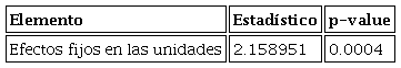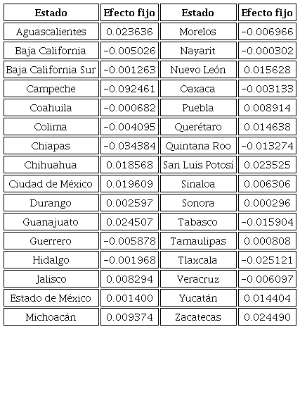 El modelo ha sido estimado mediante mínimos cuadrados generalizados (GLS), donde los errores estándar se estimaron con la corrección de White. De igual manera, la estimación se ha realizado bajo efectos fijos en las unidades, lo cual captura la heterogeneidad de cada una de las Entidades Federativas, las pruebas de la prueba de efectos fijos redundantes, así como los valores estimados de los efectos fijos se encuentran en los Anexos que aparecen al final del artículo (Anexo 3 y Anexo 4). En los mismos Anexos se encuentran los resultados de estacionariedad de las variables, donde se ha encontrado a través de la prueba Dickey-Fuller Aumentada (DFA) que las variables son estacionarias; así mismo, la estacionariedad de los residuos fue puesta a prueba mediante la prueba DFA, obteniendo residuos estacionarios (Anexo 1). Otro supuesto de máxima relevancia es la normalidad del error, por ello se ha realizado la prueba Jarque-Bera para el error del modelo y se concluye que no se puede rechazar la normalidad (Anexo 2).